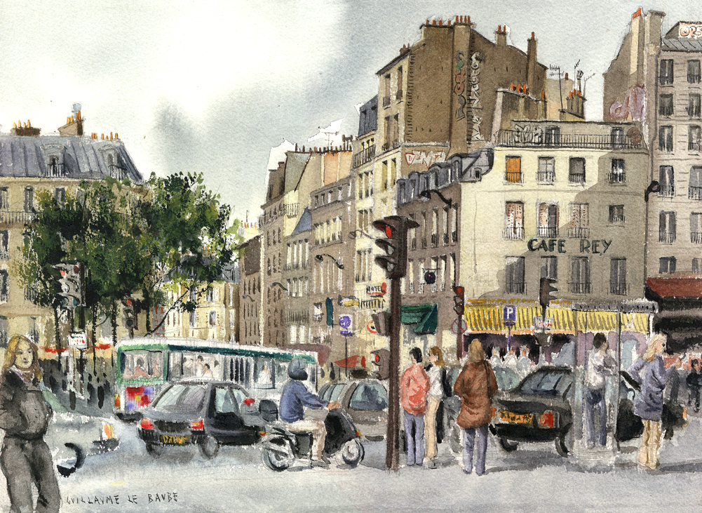 According to Guillaume « in plein air, it is essential not to spend too much time on the same pattern because the light and shadows change very quickly. You should not stay outside for more than two hours. Hence the importance of taking a photo at the beginning of the session, to capture the light as well as the (architectural) details and then continue your painting in the studio ».