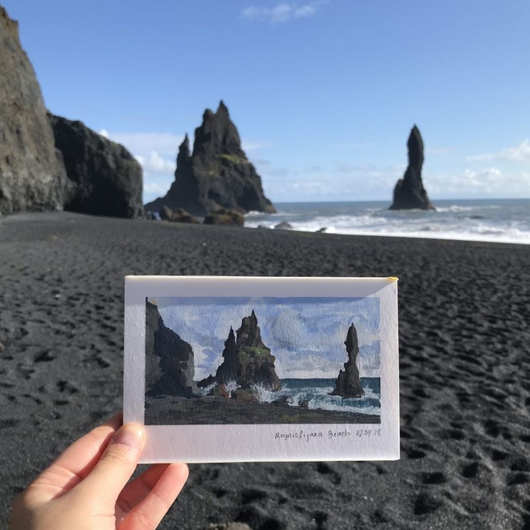 Débutons notre découverte de l’Islande par l’une des plus belles plages de sable noir du monde. Située au sud de l’île, La plage de Reynir, ou Reynisfjara en islandais, est un vrai chef-d’œuvre de la nature. Son sable noir volcanique offre un contraste saisissant avec l’écume blanche des vagues et le bleu de l’océan. La plage qui s’étend sur des kilomètres est également célèbre pour ses piliers de basalte se dressant sur l’océan. Un décor unique capturé à merveille par l’artiste Nathalie Jones.