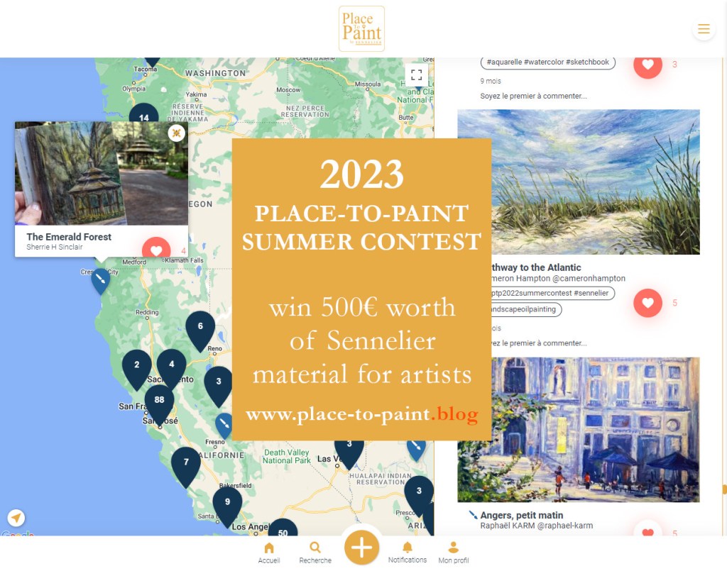 Ce concours est réservé aux artistes du plein air (peintre de paysage en extérieur) membre du site Place to Paint, du 1er juillet au 31 août 2023. Place-To-Paint est un site qui permet de partager et localiser vos œuvres/événements plein air via une carte interactive. Le gagnant sélectionné par l’équipe Sennelier sera contacté via le site Place-to-Paint, Facebook ou Instagram. Il se verra offrir 500€* de matériels Sennelier.